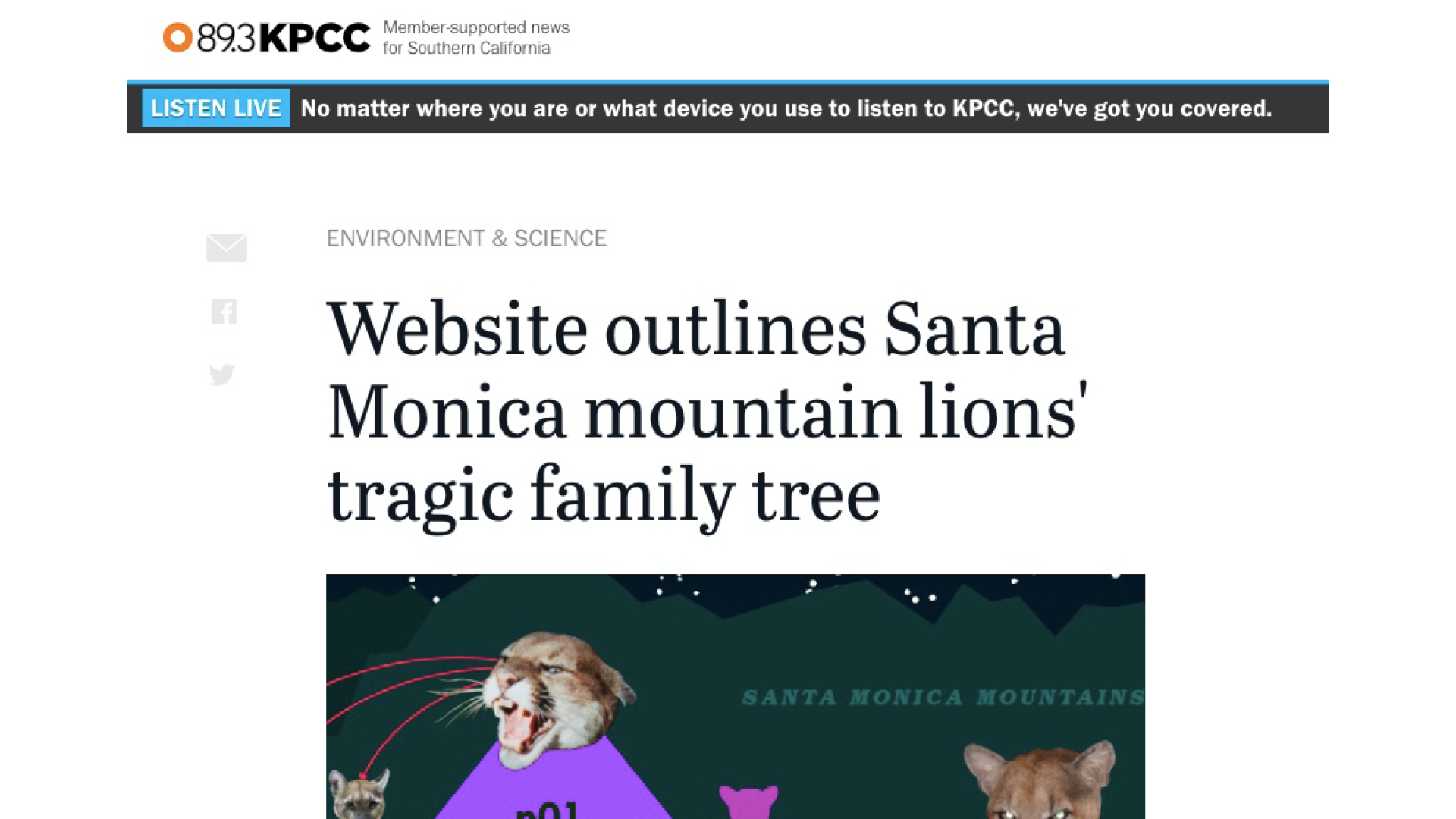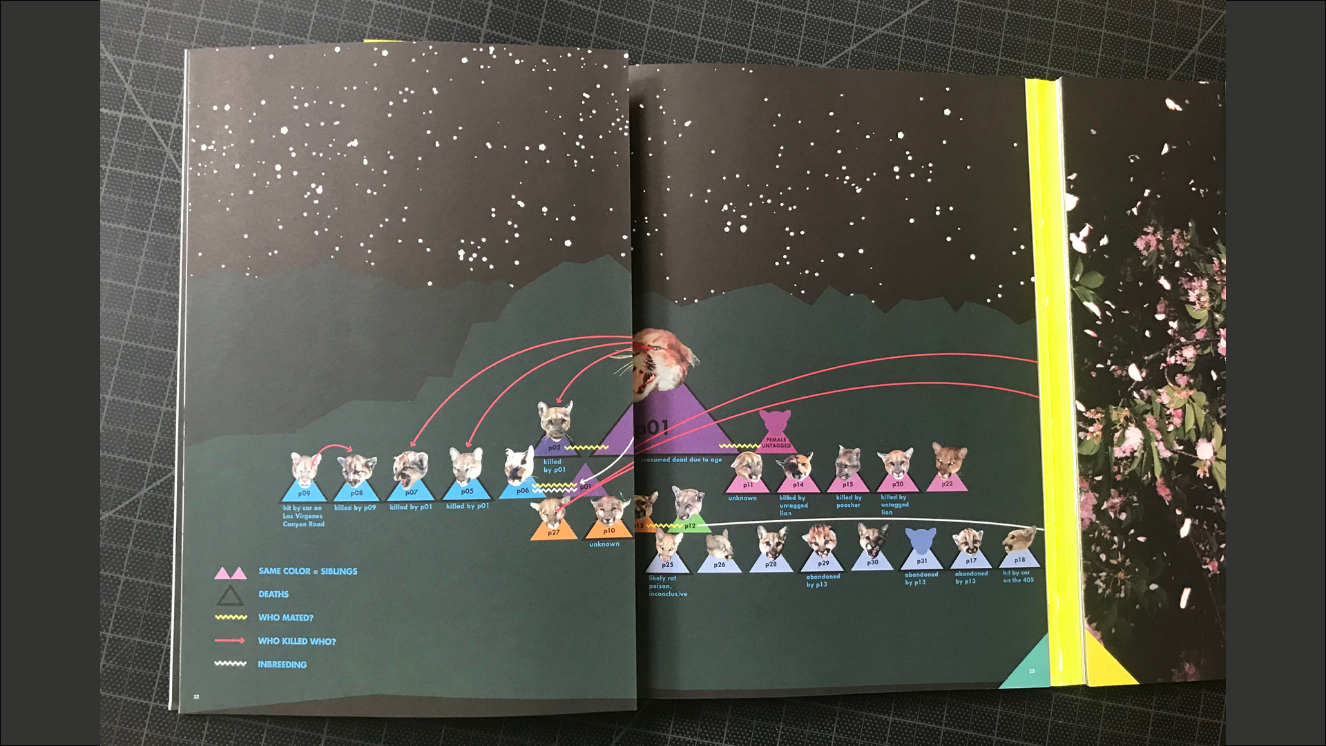 A website showing the tangled family tree of Los Angeles' resident mountain lions. Included in Kulturfolger Magazine Issue #1 with an accompanying essay. Featured in the book Carnivore Minds and covered by KPCC public radio. Presented at the Balance/Unbalance, A Sense of Place conference in Plymouth, England.